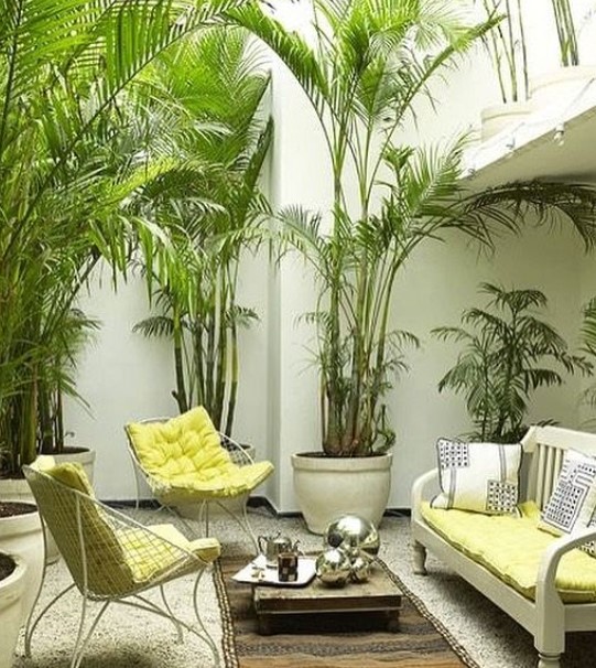 Les grandes plantes tropicales sont disposées en périphérie, autour d’une table ou d’un coin détente. Elles filtrent la lumière, protègent du vis-à-vis et créent une atmosphère fraîche, presque enveloppante.